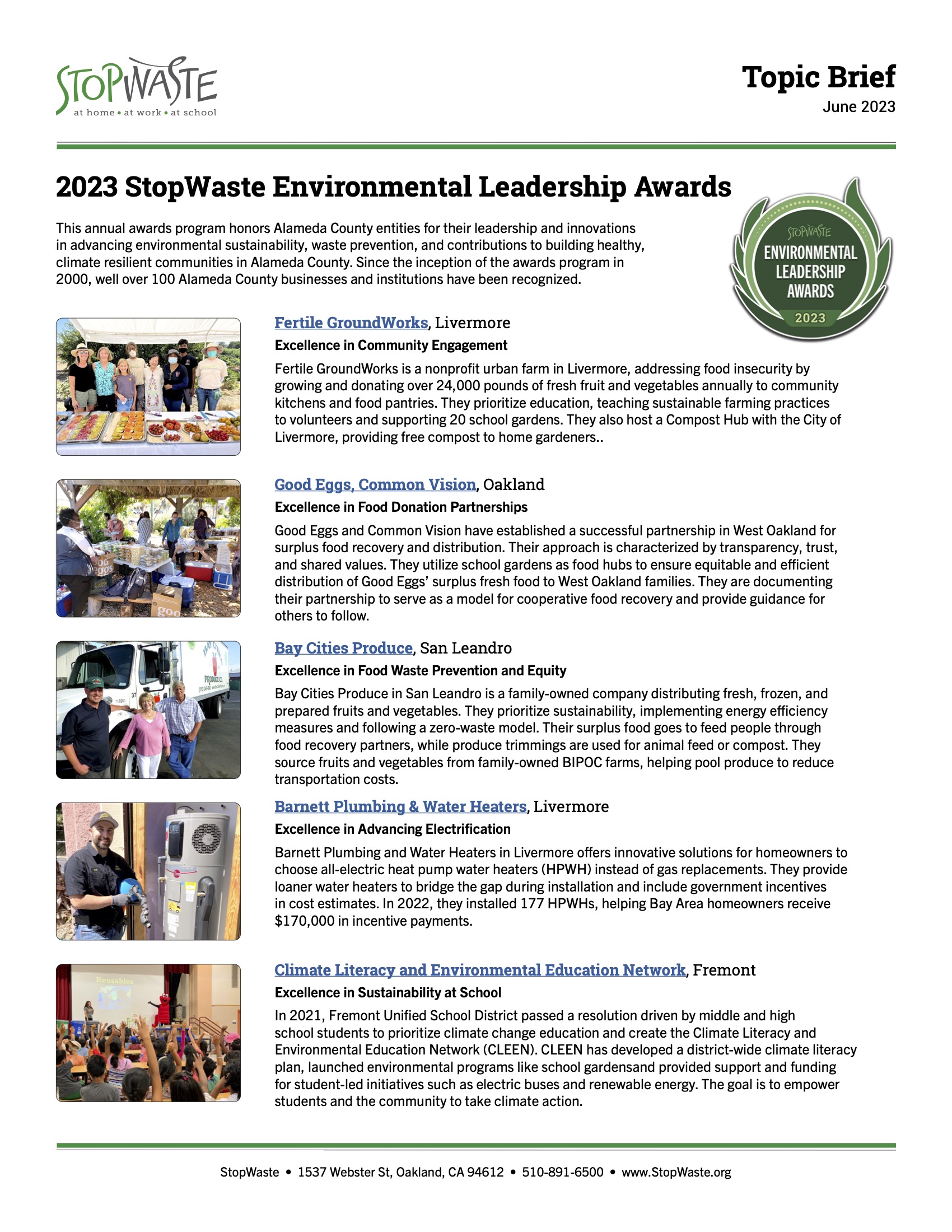 2023 StopWaste Environmental Leadership Awards - June 2023