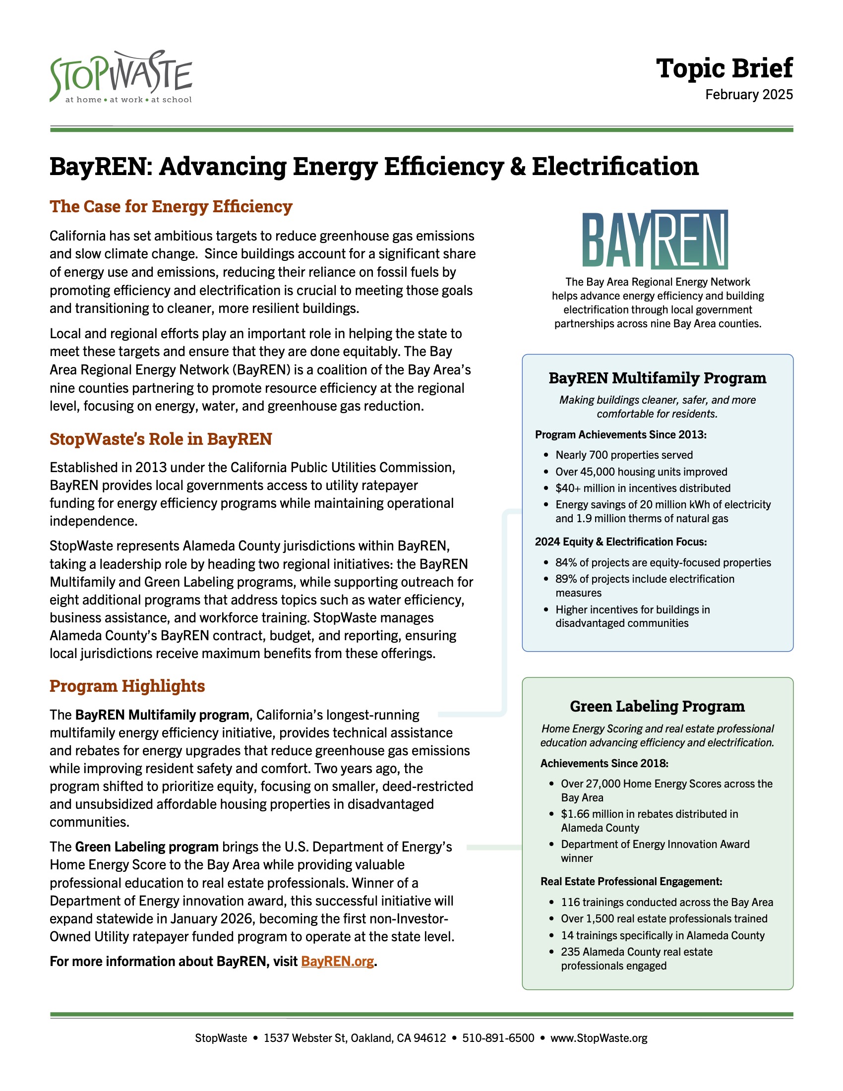 Local and regional efforts play an important role in helping the state to meet these targets and ensure that they are done equitably. The Bay Area Regional Energy Network (BayREN) is a coalition of the Bay Area’s nine counties partnering to promote resource efficiency at the regional level, focusing on energy, water, and greenhouse gas reduction.
