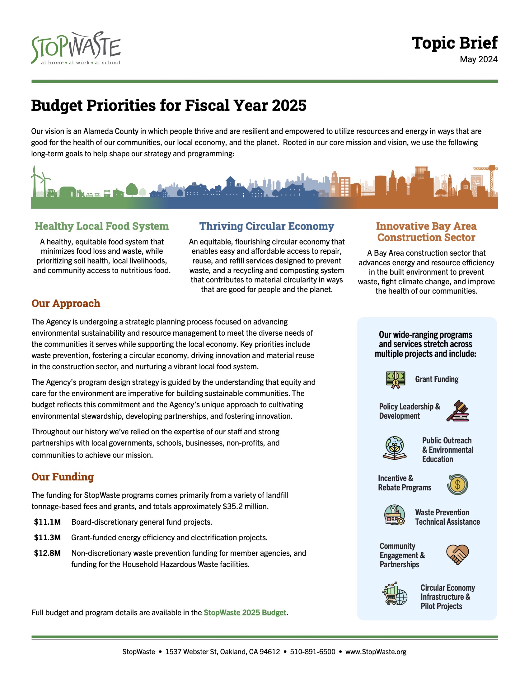 This provides an overview of the StopWaste Budget for FY 2025. It outlines the agency's strategic priorities and funding allocation for the coming year, which focuses on advancing environmental sustainability, fostering a circular economy, driving innovation in construction, and nurturing a local food system through various programs, partnerships, and community engagement. The complete budget document is available here.