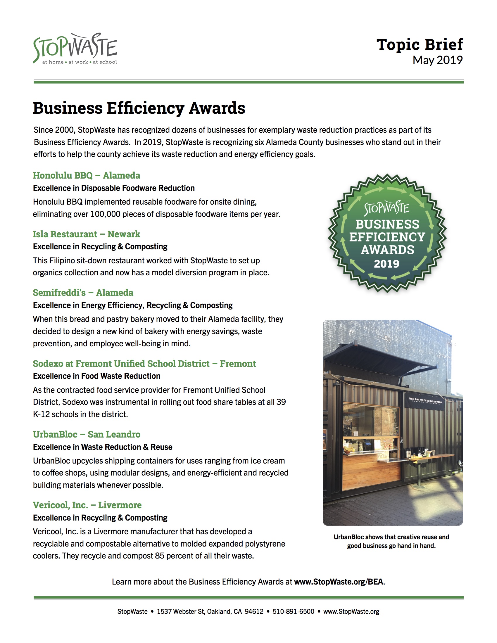 Since 2000, StopWaste has recognized dozens of businesses for exemplary waste reduction practices as part of its Business Efficiency Awards. In 2019, StopWaste is recognizing six Alameda County businesses who stand out in their efforts to help the county achieve its waste reduction and energy efficiency goals.