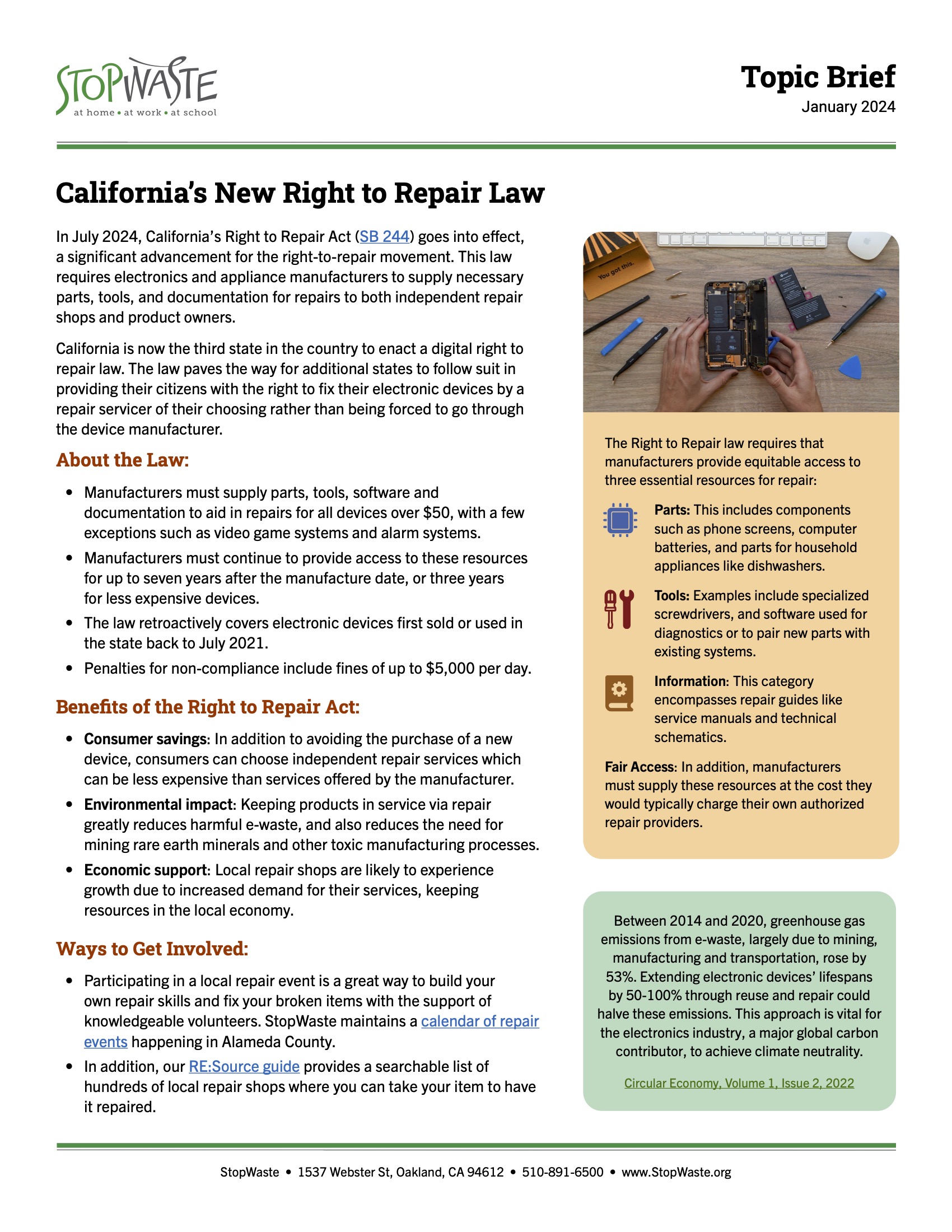 In July 2024, California’s Right to Repair Act (SB 244) goes into effect, a significant advancement for the right-to-repair movement. This law requires electronics and appliance manufacturers to supply necessary parts, tools, and documentation for repairs to both independent repair shops and product owners.