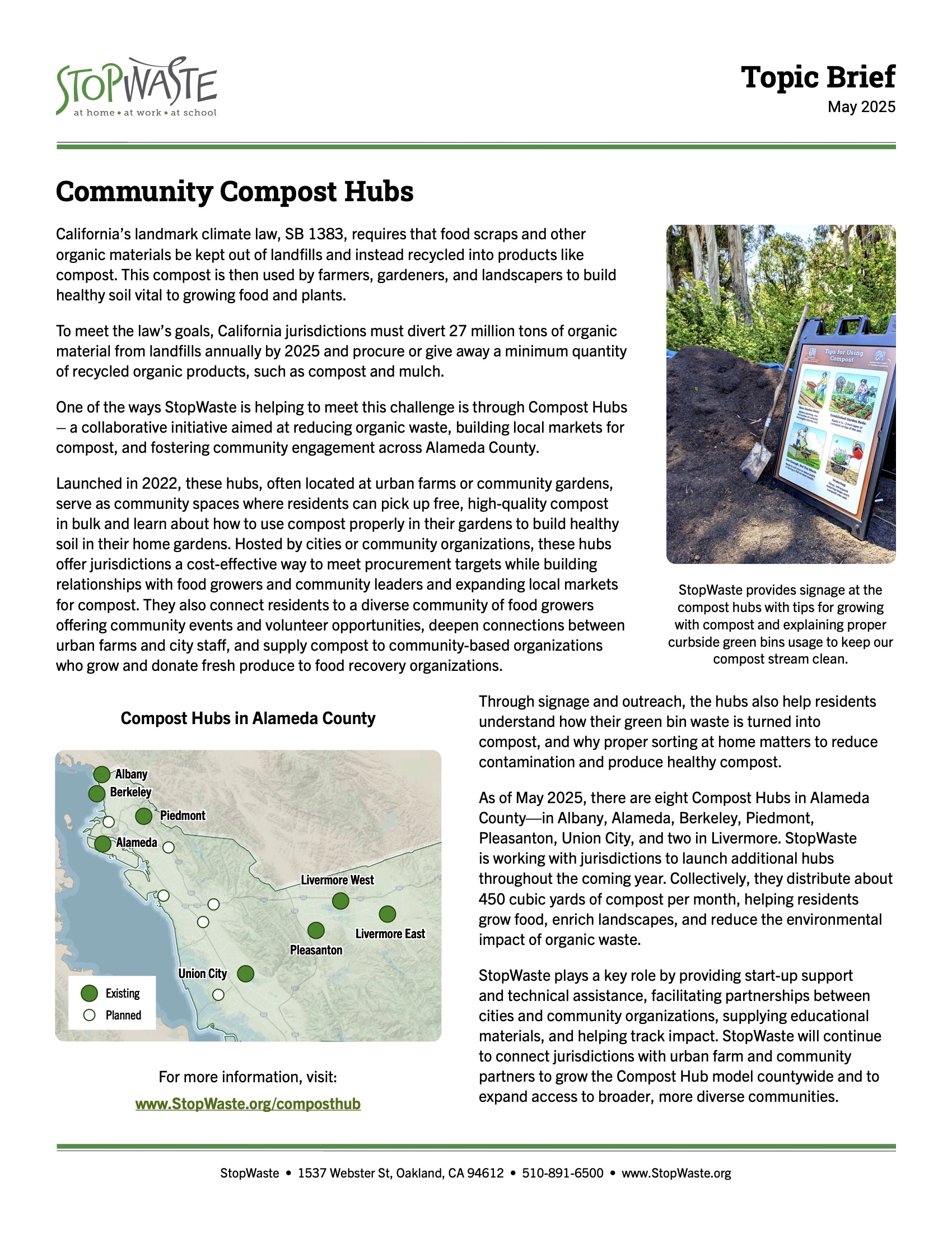 One of the ways StopWaste is helping to meet this challenge is through Compost Hubs – a collaborative initiative aimed at reducing organic waste, building local markets for compost, and fostering community engagement across Alameda County.