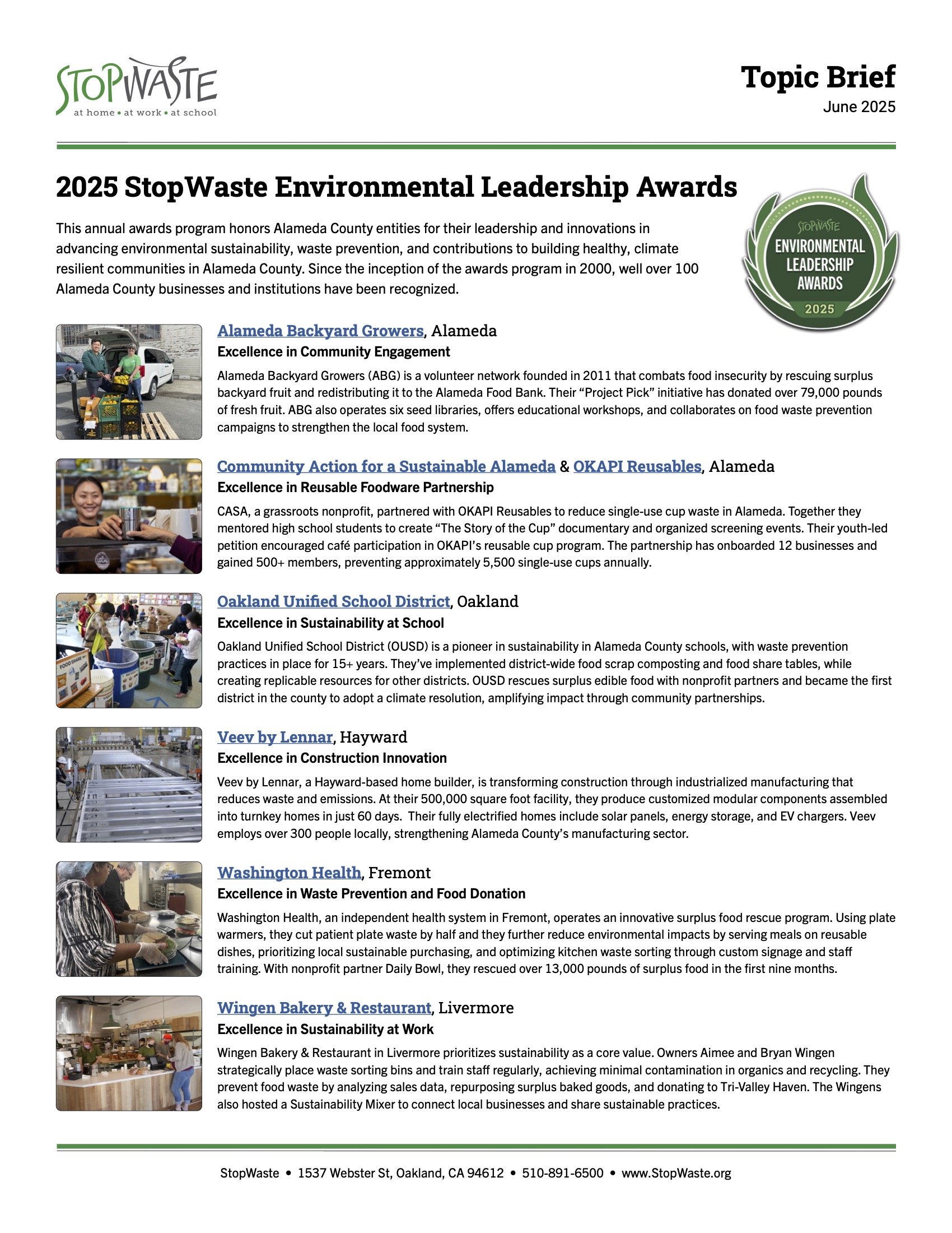 This annual awards program honors Alameda County entities for their leadership and innovations in advancing environmental sustainability, waste prevention, and contributions to building healthy, climate resilient communities in Alameda County. Since the inception of the awards program in 2000, well over 100 Alameda County businesses and institutions have been recognized.