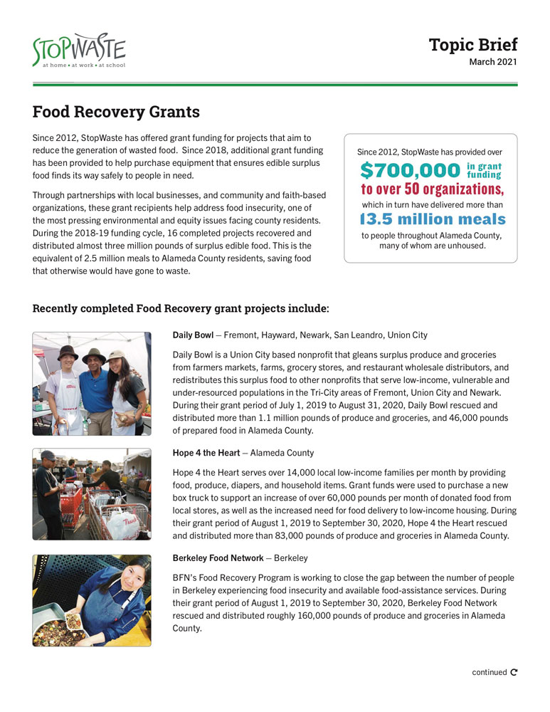 Since 2012, StopWaste has offered grant funding for projects that aim to reduce the generation of wasted food. Since 2018, additional grant funding has been provided to help purchase equipment that ensures edible surplus food finds its way safely to people in need.