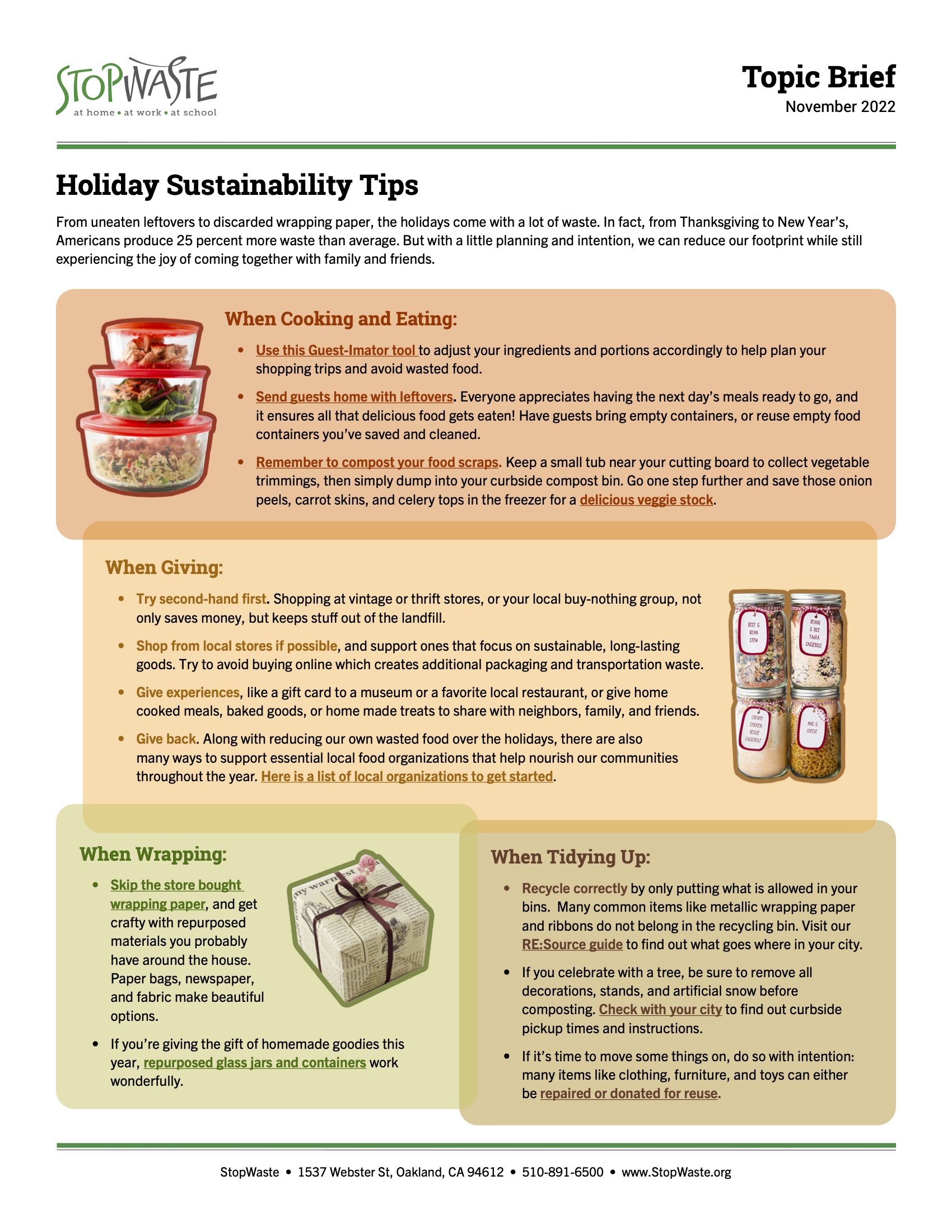From uneaten leftovers to discarded wrapping paper, the holidays come with a lot of waste. In fact, from Thanksgiving to New Year’s, Americans produce 25 percent more waste than average. But with a little planning and intention, we can reduce our footprint while still experiencing the joy of coming together with family and friends.