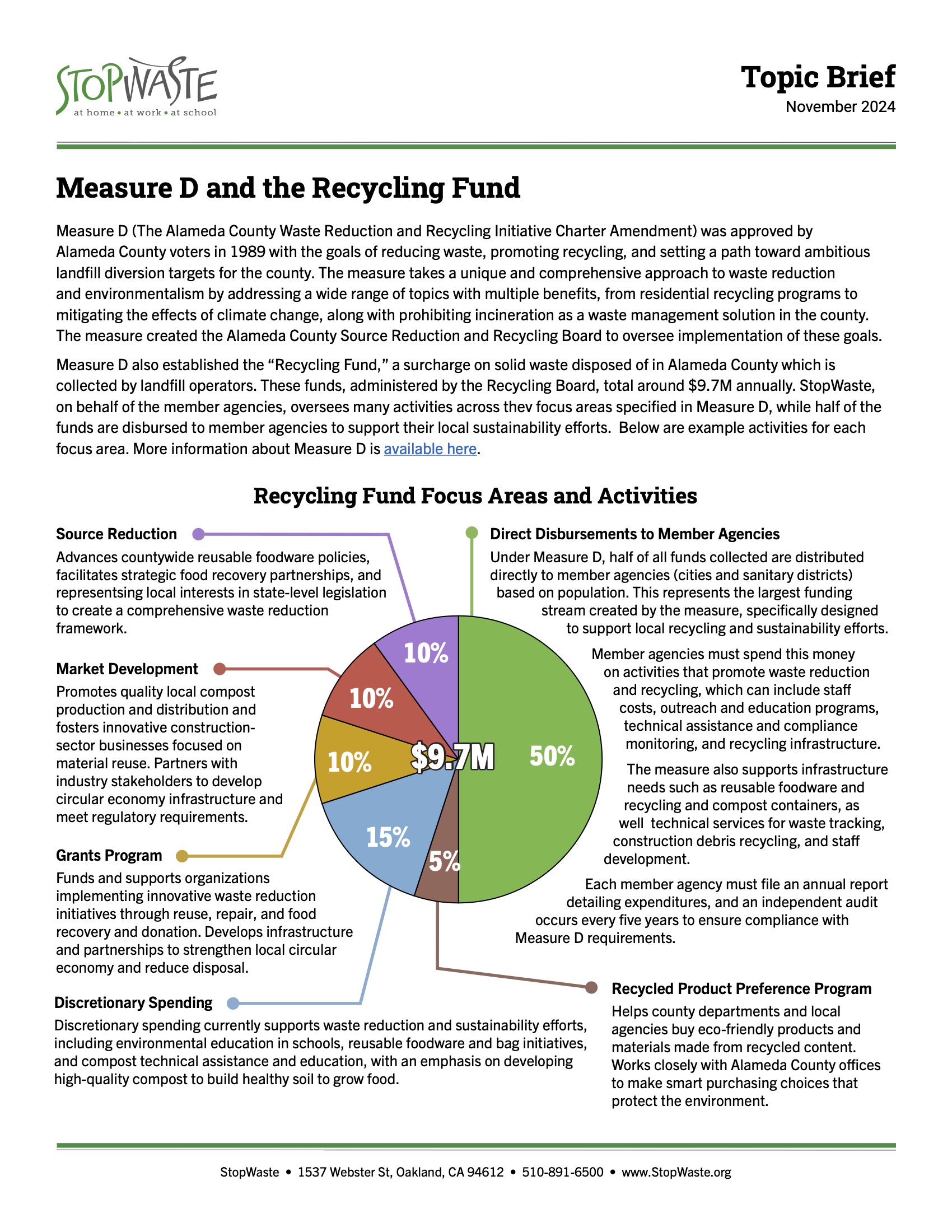 Measure D also established the “Recycling Fund,” a surcharge on solid waste disposed of in Alameda County which is collected by landfill operators. These funds, administered by the Recycling Board, total around $9.7M annually. StopWaste, on behalf of the member agencies, oversees many activities across the focus areas specified in Measure D, while half of the funds are disbursed to member agencies to support their local sustainability efforts.