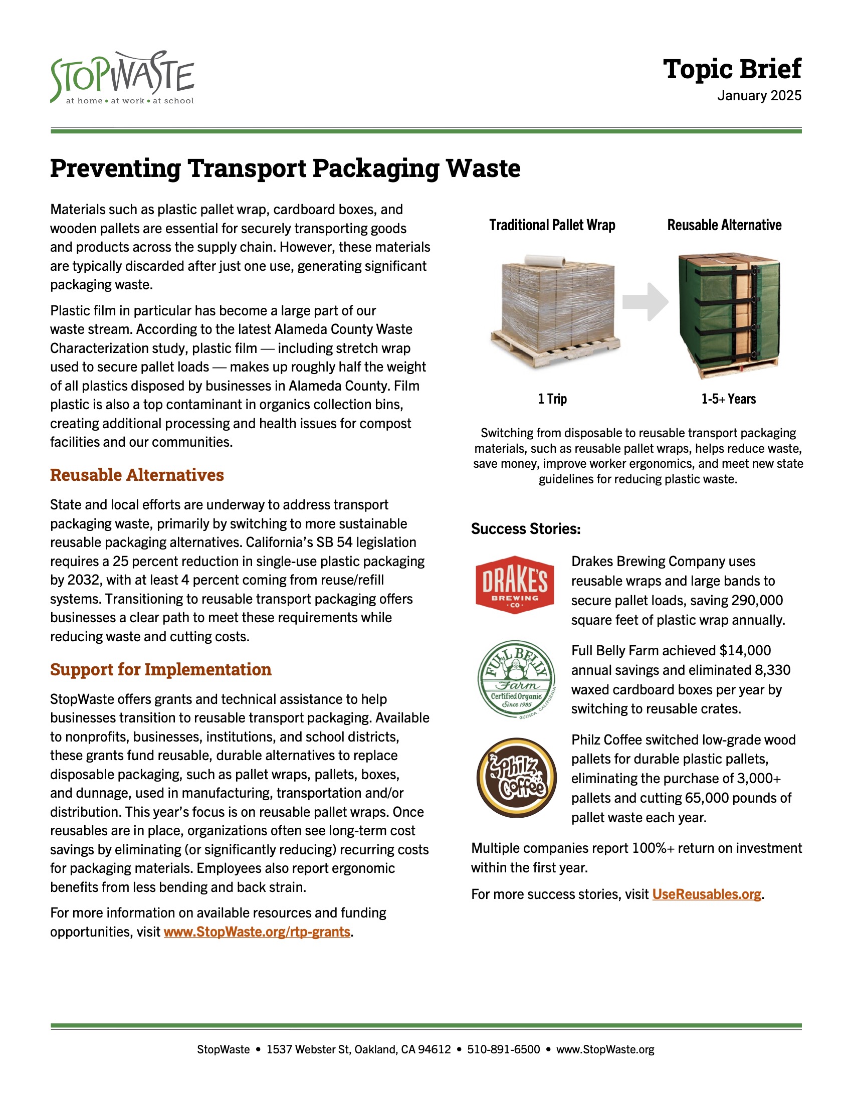 Plastic film in particular has become a large part of our waste stream. According to the latest Alameda County Waste Characterization study, plastic film — including stretch wrap used to secure pallet loads — makes up roughly half the weight of all plastics disposed by businesses in Alameda County. Film plastic is also a top contaminant in organics collection bins, creating additional processing and health issues for compost facilities and our communities.