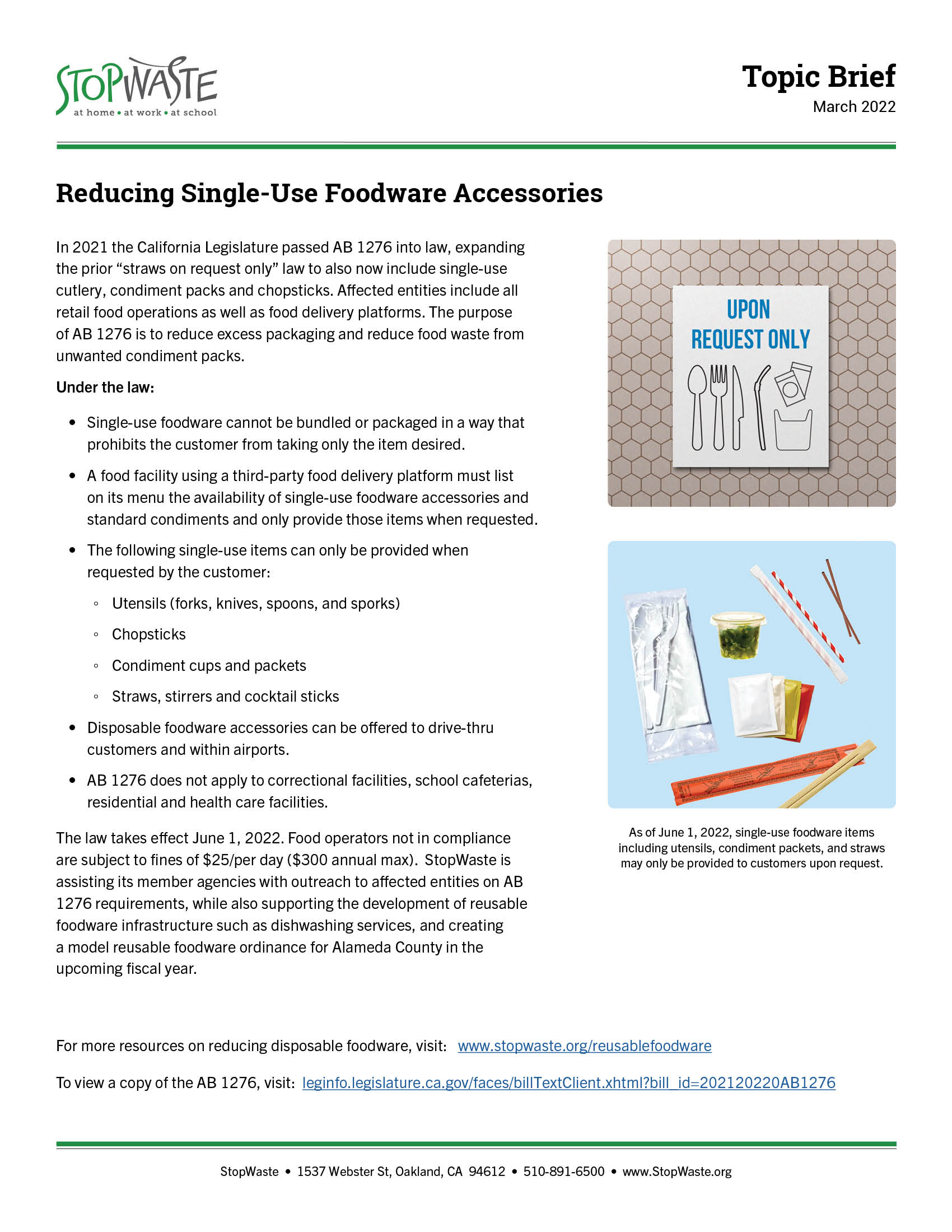 The law takes effect June 1, 2022. Food operators not in compliance are subject to fines of $25/per day ($300 annual max). StopWaste is assisting its member agencies with outreach to affected entities on AB 1276 requirements, while also supporting the development of reusable foodware infrastructure such as dishwashing services, and creating a model reusable foodware ordinance for Alameda County in the upcoming fiscal year.