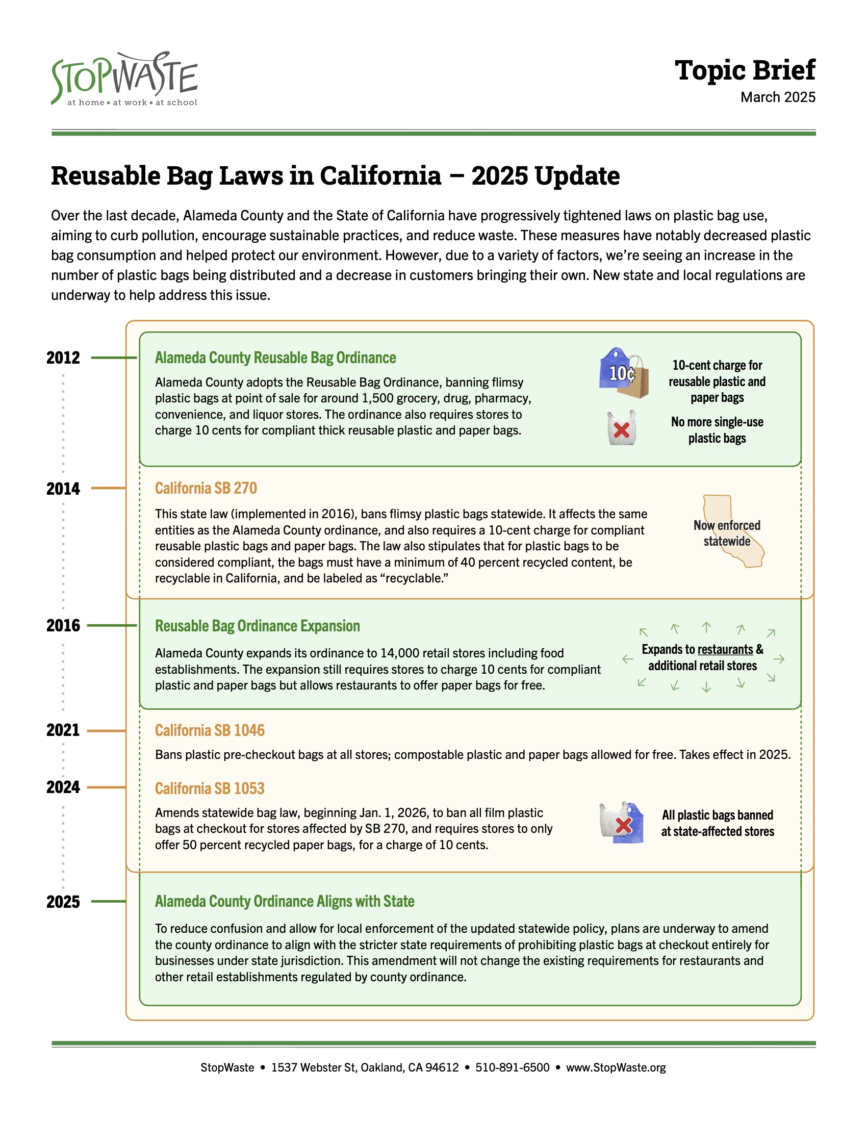 Over the last decade, Alameda County and the State of California have progressively tightened laws on plastic bag use, aiming to curb pollution, encourage sustainable practices, and reduce waste. These measures have notably decreased plastic bag consumption and helped protect our environment. However, due to a variety of factors, we’re seeing an increase in the number of plastic bags being distributed and a decrease in customers bringing their own. New state and local regulations are underway to help address this issue.