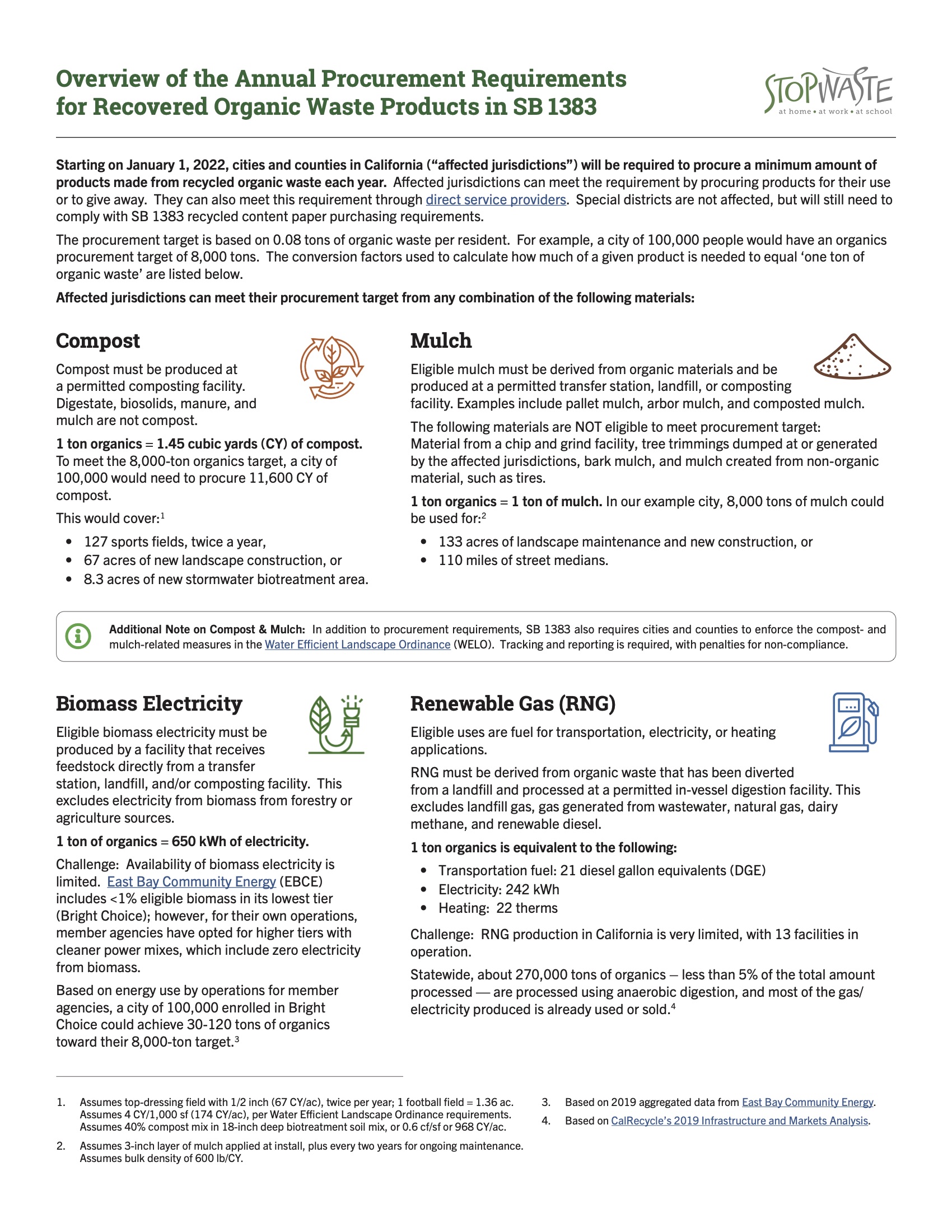 The procurement target is based on 0.08 tons of organic waste per resident. For example, a city of 100,000 people would have an organics procurement target of 8,000 tons. Affected jurisdictions can meet their procurement target from any combination of the following materials: compost, mulch, electricity generated from biomass, and renewable gas.