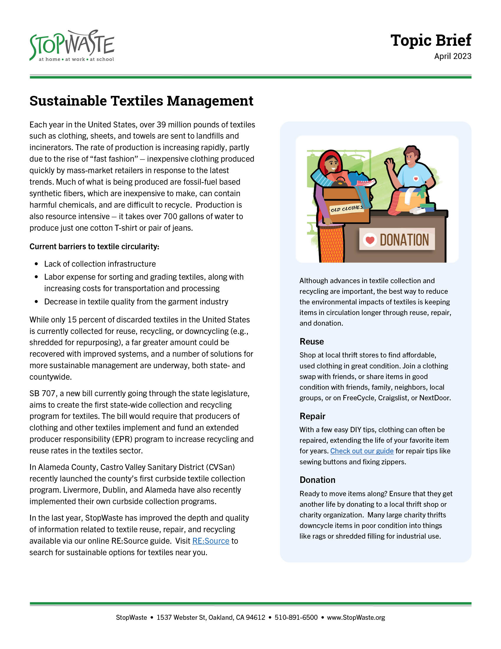 While only 15 percent of discarded textiles in the United States is currently collected for reuse, recycling, or downcycling (e.g., shredded for repurposing), a far greater amount could be recovered with improved systems, and a number of solutions for more sustainable management are underway, both state- and countywide.