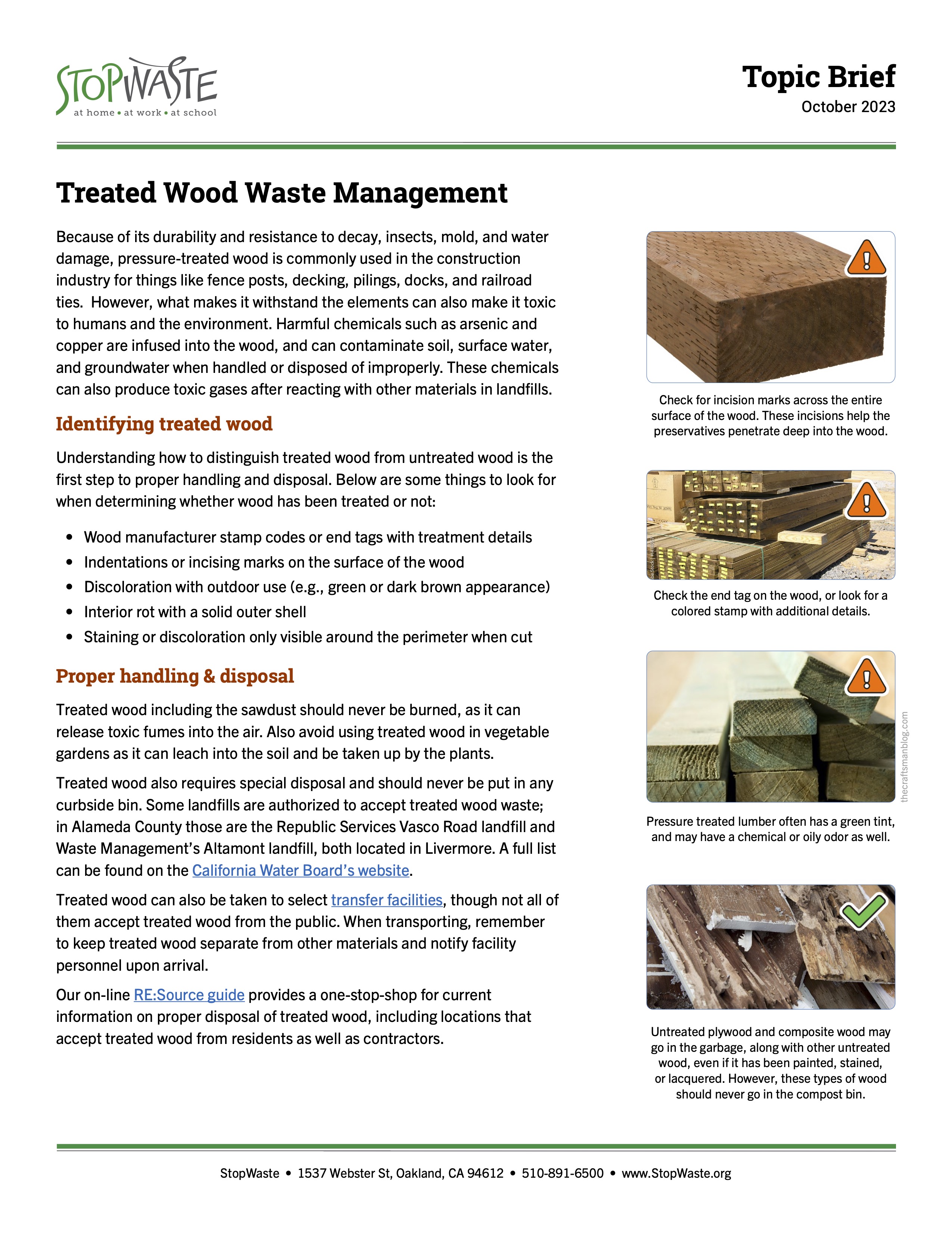 Because of its durability and resistance to decay, insects, mold, and water damage, pressure-treated wood is commonly used in the construction industry for things like fence posts, decking, pilings, docks, and railroad ties. However, what makes it withstand the elements can also make it toxic to humans and the environment. Harmful chemicals such as arsenic and copper are infused into the wood, and can contaminate soil, surface water, and groundwater when handled or disposed of improperly. These chemicals can also produce toxic gases after reacting with other materials in landfills.