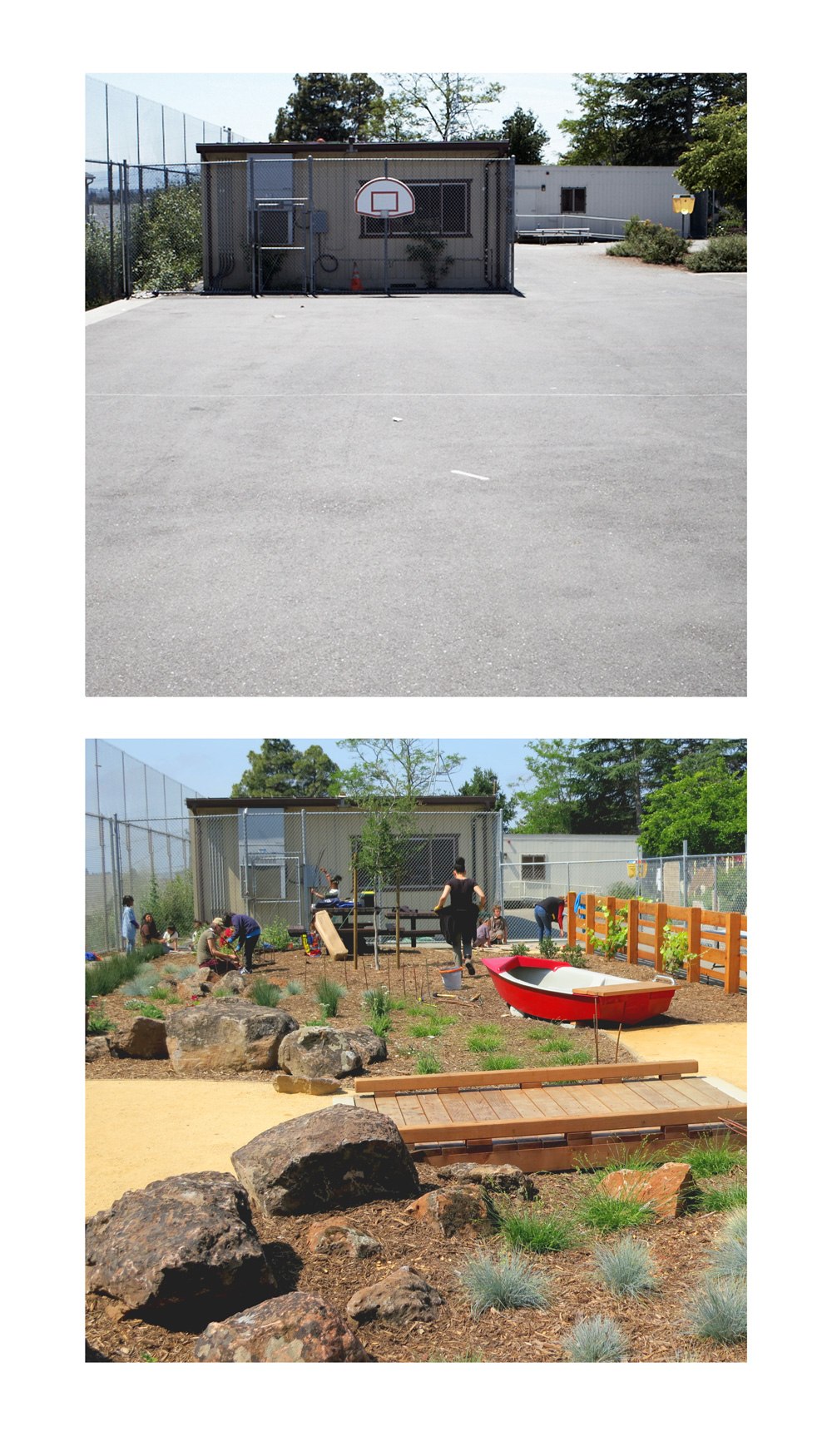 A gentle swale, boulders and reclaimed logs, a salvaged play boat and California native plants provide K-5 students with imaginative, constructive and nature-play opportunities. Picnic tables and an outdoor gathering area built of locally sourced boulders allow teachers to use the space for outdoor instruction to enhance their classroom work.