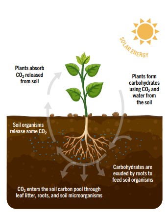 Carbon farming practices draw carbon dioxide from the atmosphere and store it in the soil, a process called carbon sequestration. These techniques focus on growing healthy plants and building up soil microbes. Plants naturally absorb carbon dioxide from the atmosphere during growth and their roots exude it as carbohydrates that nourish soil microorganisms. When the microorganisms and plants die they break down and build up the carbon stored in the soil.