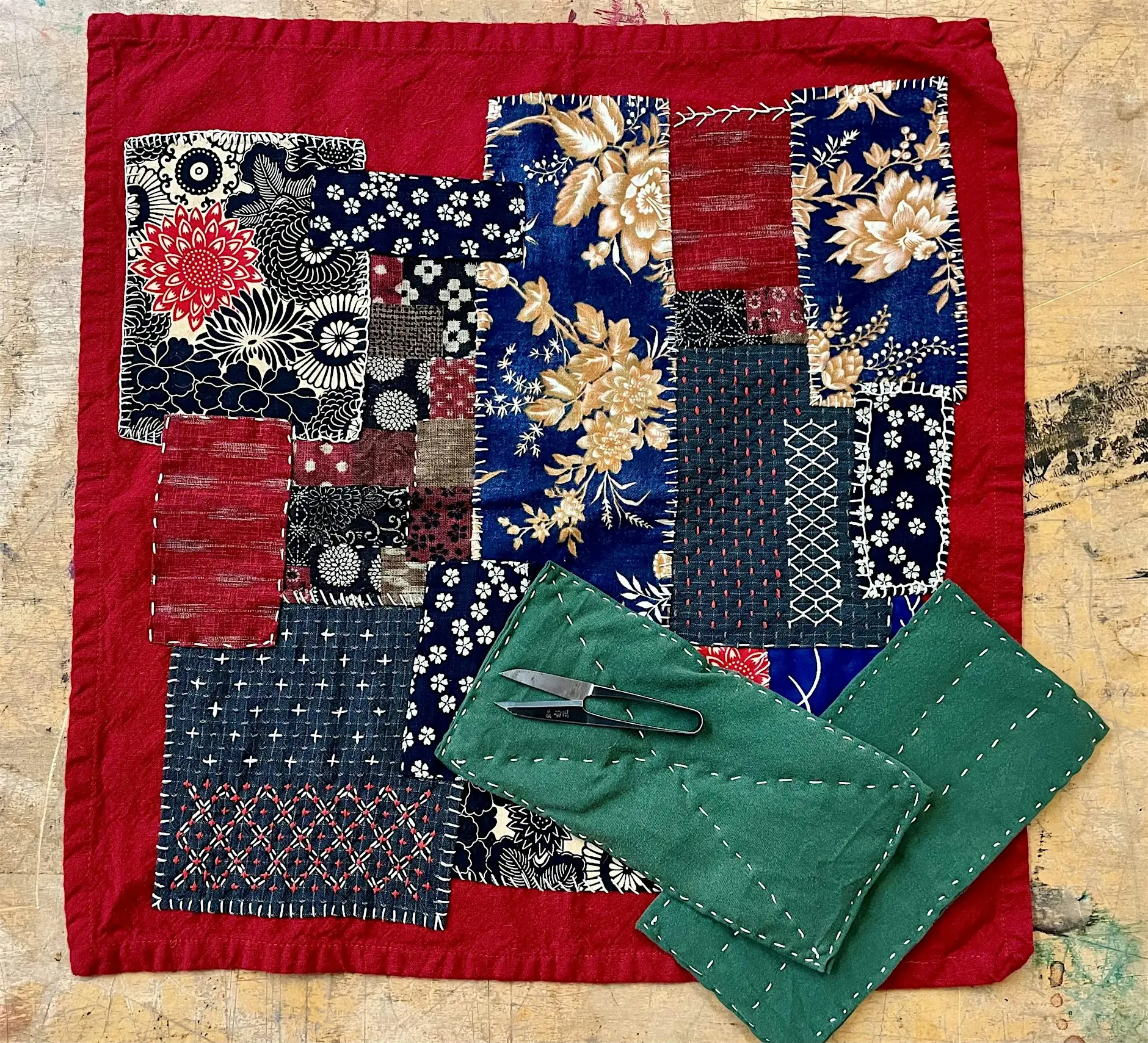 Learn to create Japanese Boro fabric mats using textile scraps and Sashiko stitching