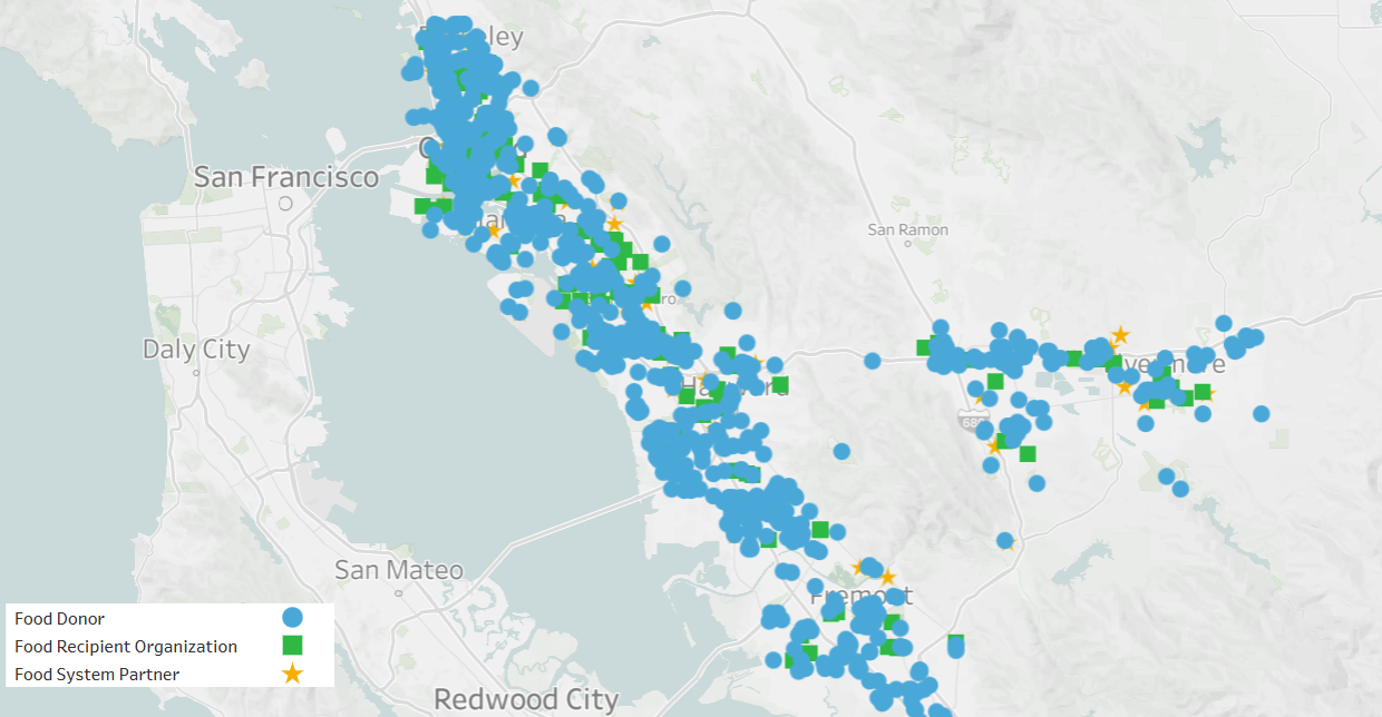 This map provides Alameda County Food Recovery Network (ACFRN) participants with a comprehensive overview of SB 1383 commercial edible food generators, food recipient organizations, and food system organizations across Alameda County. It is designed to help participants identify potential donors and partners, explore geographic areas of interest, and strengthen coordination and efficiency across the network.
