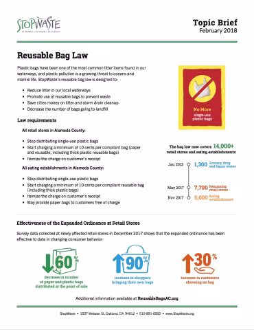 Plastic bags have been one of the most common litter items found in our waterways, and plastic pollution is a growing threat to oceans and marine life. StopWaste’s reusable bag law is designed to: Reduce litter in our local waterways Promote use of reusable bags to prevent waste Save cities money on litter and storm drain cleanup Decrease the number of bags going to landfill