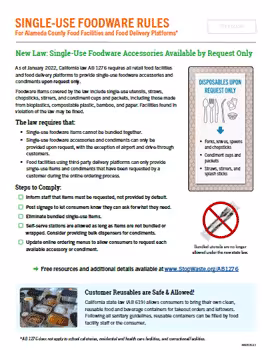 As of January 2022, California law AB 1276 requires all retail food facilities and food delivery platforms to provide single-use foodware accessories and condiments upon request only. Foodware items covered by the law include single-use utensils, straws, chopsticks, stirrers, and condiment cups and packets, including those made from bioplastics, compostable plastic, bamboo, and paper. Facilities found in violation of the law may be fined. Download this fact sheet to learn more about what the law requires and steps you can take to comply. Also available in Chinese, Spanish, and Vietnamese.