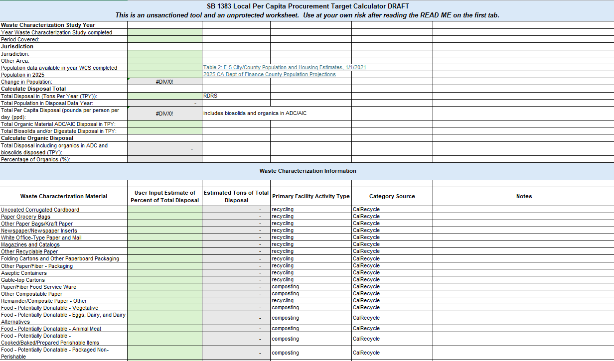Breadcrumb Home Resource Per Capita Procurement Target Calculator Per Capita Procurement Target Calculator Updated Apr 25, 2025 This tool allows jurisdictions to input local data from their waste characterization study and other waste streams as well as population to estimate a local per capita procurement target (tons per person). Downloads & Attachments Local-per-capita-calc_general_25-03-25.xlsx Image