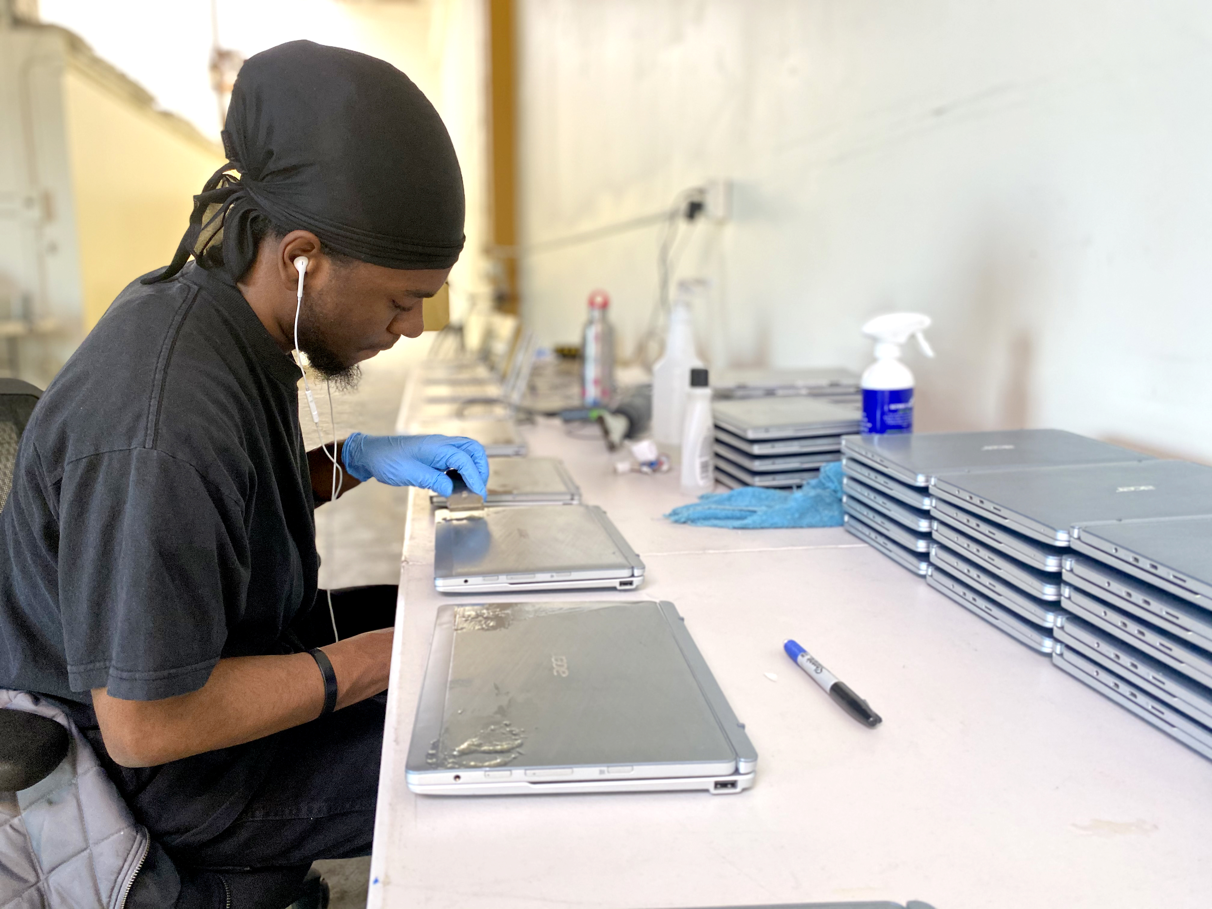 When schools switched to distance learning in mid-March 2020 due to COVID-19, it became clear just how critical Tech Exchange’s work is to ensure that Oakland public school students without home technology access aren’t left behind. To help meet the demand, Civicorps was able to increase the number of Tech Exchange interns from two to four, covering half of their wages with a $20,000 Reuse & Repair Grant from StopWaste. Working closely with Tech Exchange staff, interns learn all aspects of the refurbishing process—from testing and upgrading the devices to warehouse management and communication with customers and team members.