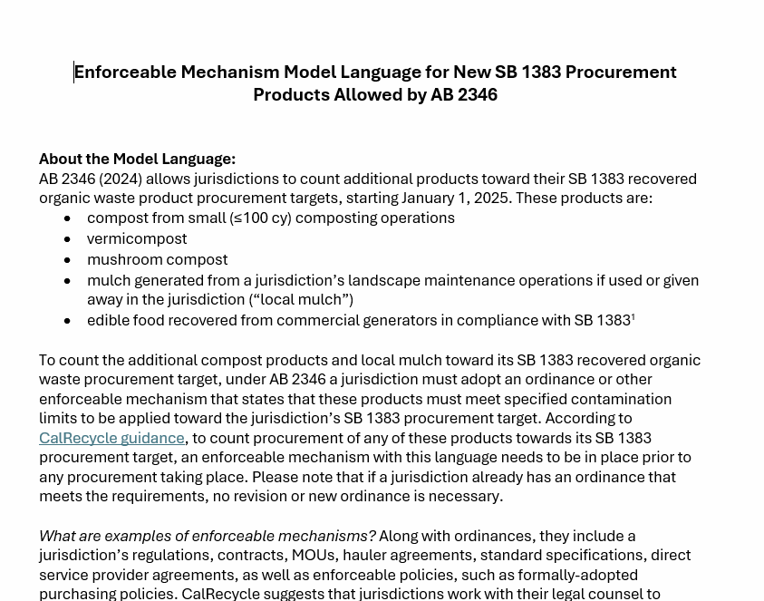 This model language is intended to be used by jurisdictions to develop an ordinance or other enforceable mechanism for mulch, local mulch, community compost, vermicompost, and mushroom compost procured in compliance with SB 1383 regulations or AB 2346.