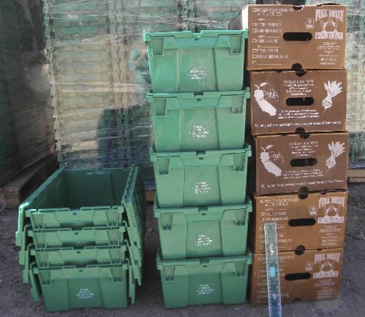Delivery containers need to be able to withstand temperatures between 40 and 120 degrees, handle exposure to summer sun and winter rain, and protect produce during shipping distances up to 150 miles. Full Belly Farm used to use waxed cardboard boxes for produce distribution. Wax on the boxes increased the life of the boxes so they could be reused several times, but also rendered them non-recyclable and noncompostable.
