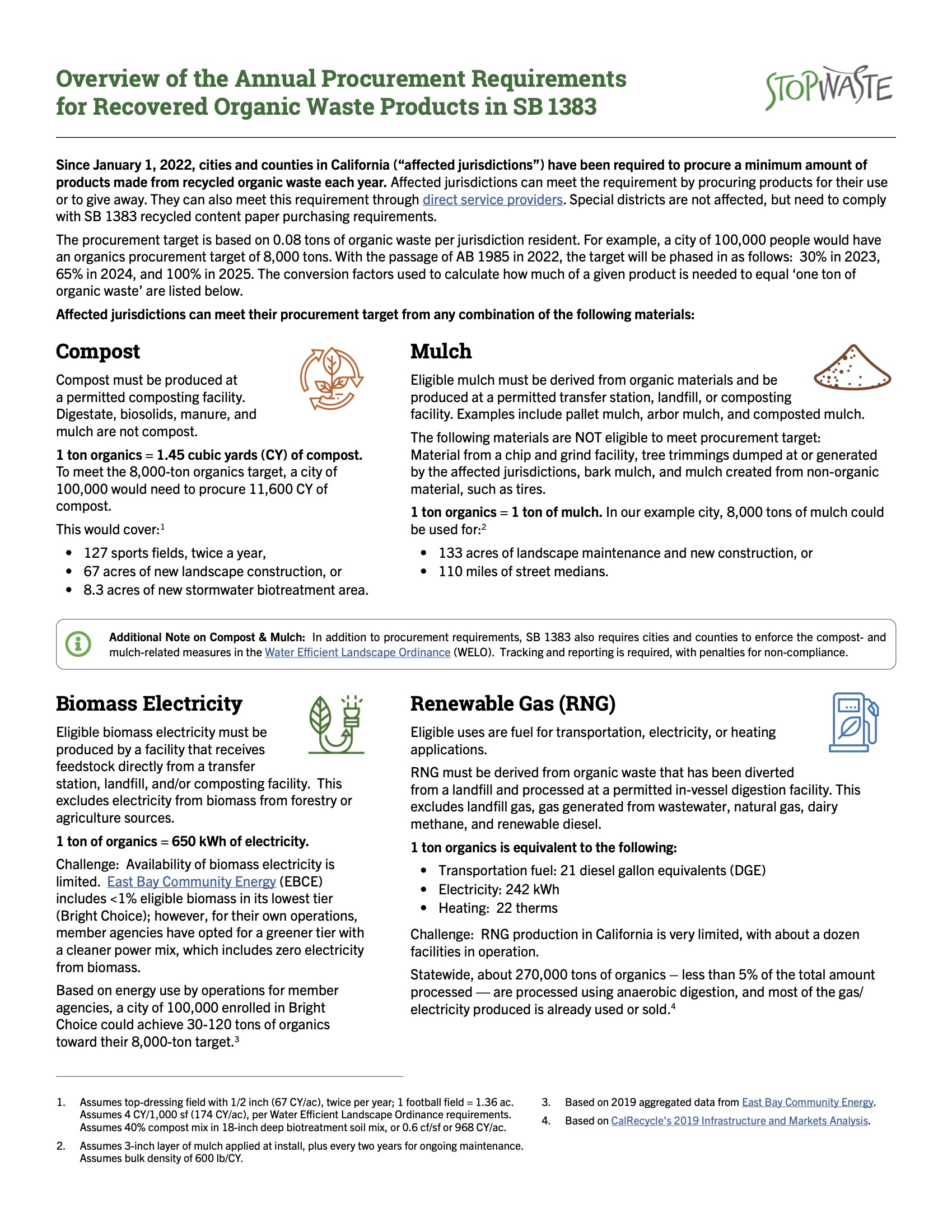 Since January 1, 2022, cities and counties in California (“affected jurisdictions”) have been required to procure a minimum amount of products made from recycled organic waste each year. Affected jurisdictions can meet the requirement by procuring products for their use or to give away. They can also meet this requirement through direct service providers. Special districts are not affected, but need to comply with SB 1383 recycled content paper purchasing requirements.