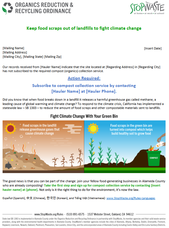This is a sample of the SB 1383/Organics Reduction and Recycling Ordinance (ORRO) non-compliance letter being mailed to selected accounts in June 2022. As part of a StopWaste study, some accounts that do not have the required compost collection service will be mailed this "pro-social" version letter and some will be mailed an "enforcement-focused" version letter.