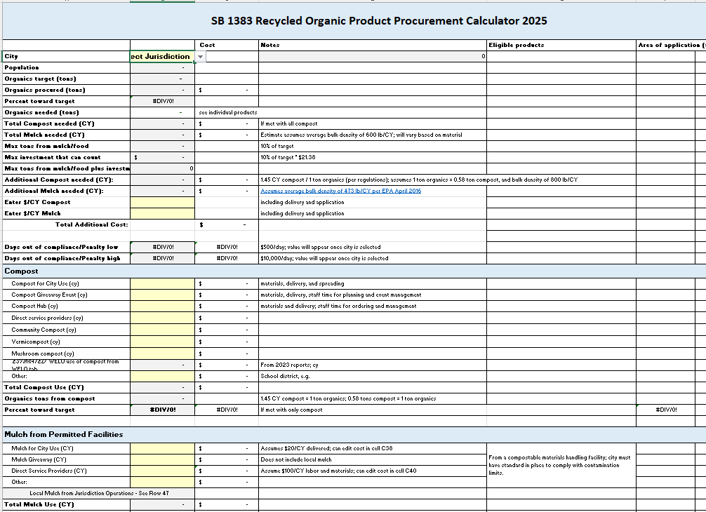 This tools calculates the procurement target for Alameda County jurisdictions using the adjusted per capita target approved by CalRecycle in March 2025. This tool also tracks procurement of new materials and investments to assist with procurement planning.