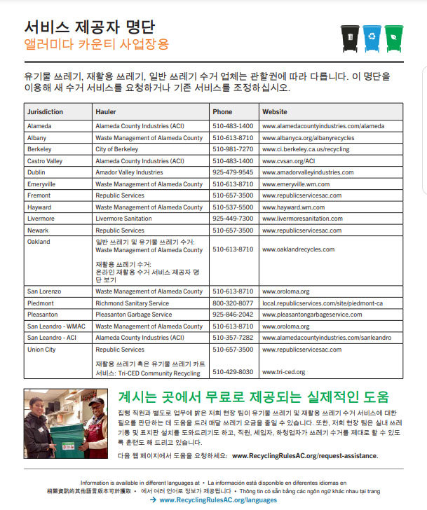 Breadcrumb Home Resource Service Provider Directory For Businesses (Korean) Service Provider Directory for Businesses (Korean) Updated Oct 21, 2021 서비스 제공자 명단 앨러미다 카운티 사업장용유기물 쓰레기, 재활용 쓰레기, 일반 쓰레기 수거 업체는 관할권에 따라 다릅니다. 이 명단을 이용해 새 수거 서비스를 요청하거나 기존 서비스를 조정하십시오. Downloads & Attachments Biz-Service-Provider-Directory_Korean.pdf Image Topic Mandatory Recycling