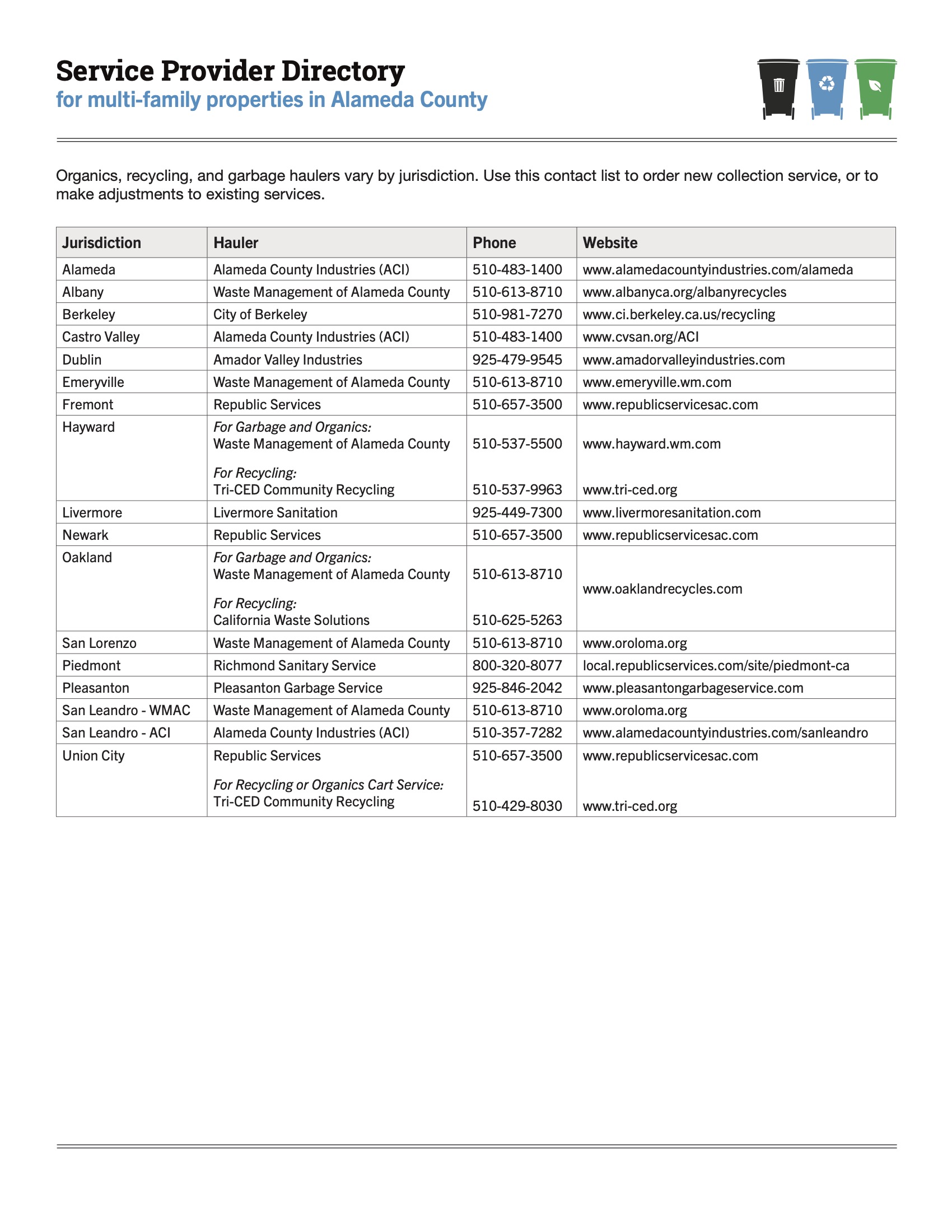 A new California State law, SB 1383, aims to keep food and other compostable materials ("organics") out of landfills to reduce emissions that contribute to climate change. Organics, recycling, and garbage haulers vary by jurisdiction. Use this contact list to order new collection service, or to make adjustments to existing services. Although this document describes the Mandatory Composting & Recycling law, it also applies to the new California State law, SB 1383, that will be implemented In Alameda County under the Organics Reduction & Recycling Ordinance (ORRO).