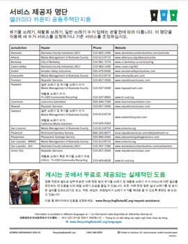Breadcrumb Home Resource Service Provider Directory For Multi-Family Properties (Korean) Service Provider Directory for Multi-Family Properties (Korean) Updated Oct 21, 2021 서비스 제공자 명단 앨러미다 카운티 공동주택단지용유기물 쓰레기, 재활용 쓰레기, 일반 쓰레기 수거 업체는 관할권에 따라 다릅니다. 이 명단을 이용해 새 수거 서비스를 요청하거나 기존 서비스를 조정하십시오. Downloads & Attachments MF-Service-Provider-Directory_Korean.pdf Image Topic Composting Food Scraps Mandatory Recycling