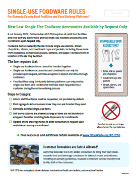 As of January 2022, California law AB 1276 requires all retail food facilities and food delivery platforms to provide single-use foodware accessories and condiments upon request only.