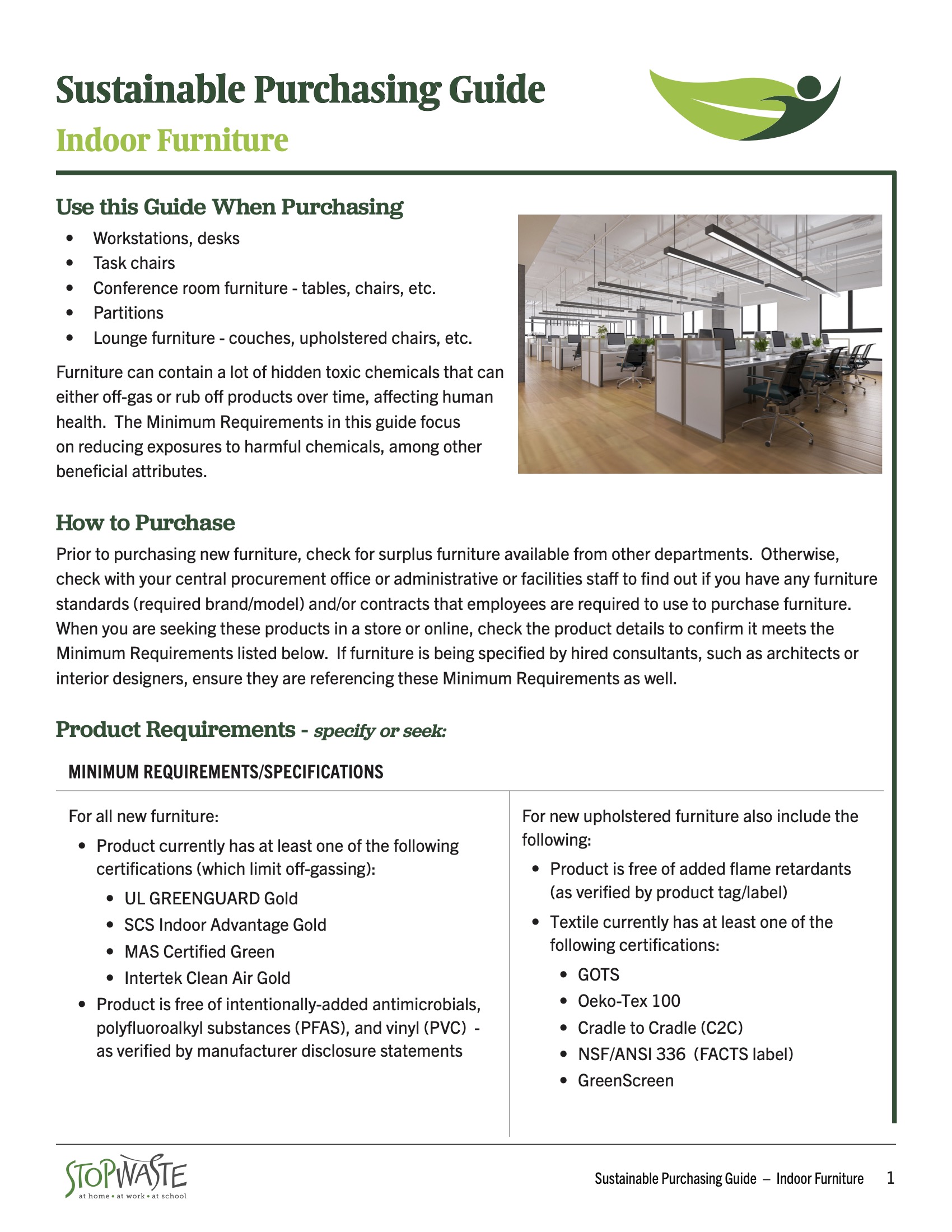 Furniture can contain a lot of hidden toxic chemicals that can either off-gas or rub off products over time, affecting human health. The Minimum Requirements in this guide focus on reducing exposures to harmful chemicals, among other beneficial attributes.