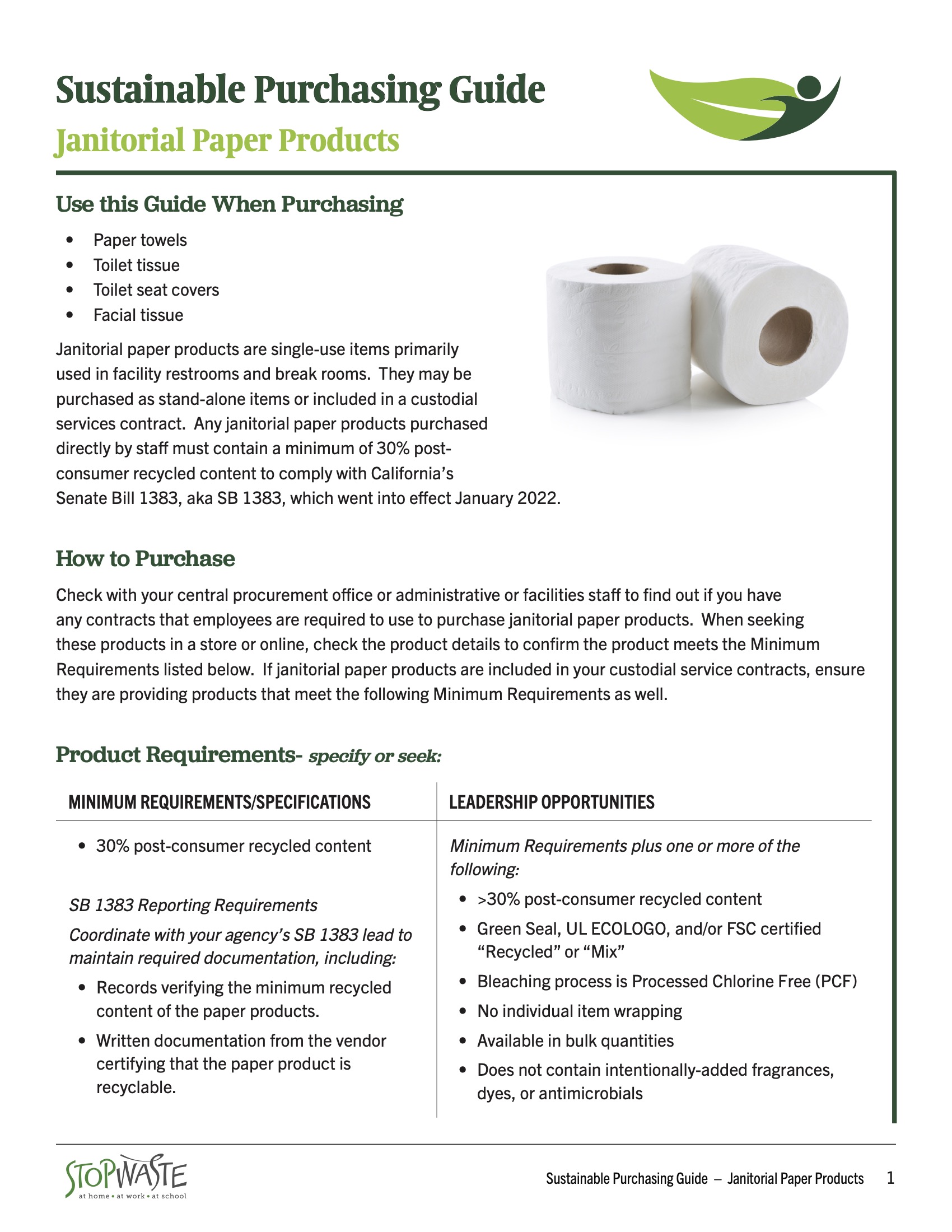 Janitorial paper products are single-use items primarily used in facility restrooms and break rooms. They may be purchased as stand-alone items or included in a custodial services contract. Any janitorial paper products purchased directly by staff must contain a minimum of 30% post-consumer recycled content to comply with California’s Senate Bill 1383, aka SB 1383, which went into effect January 2022.