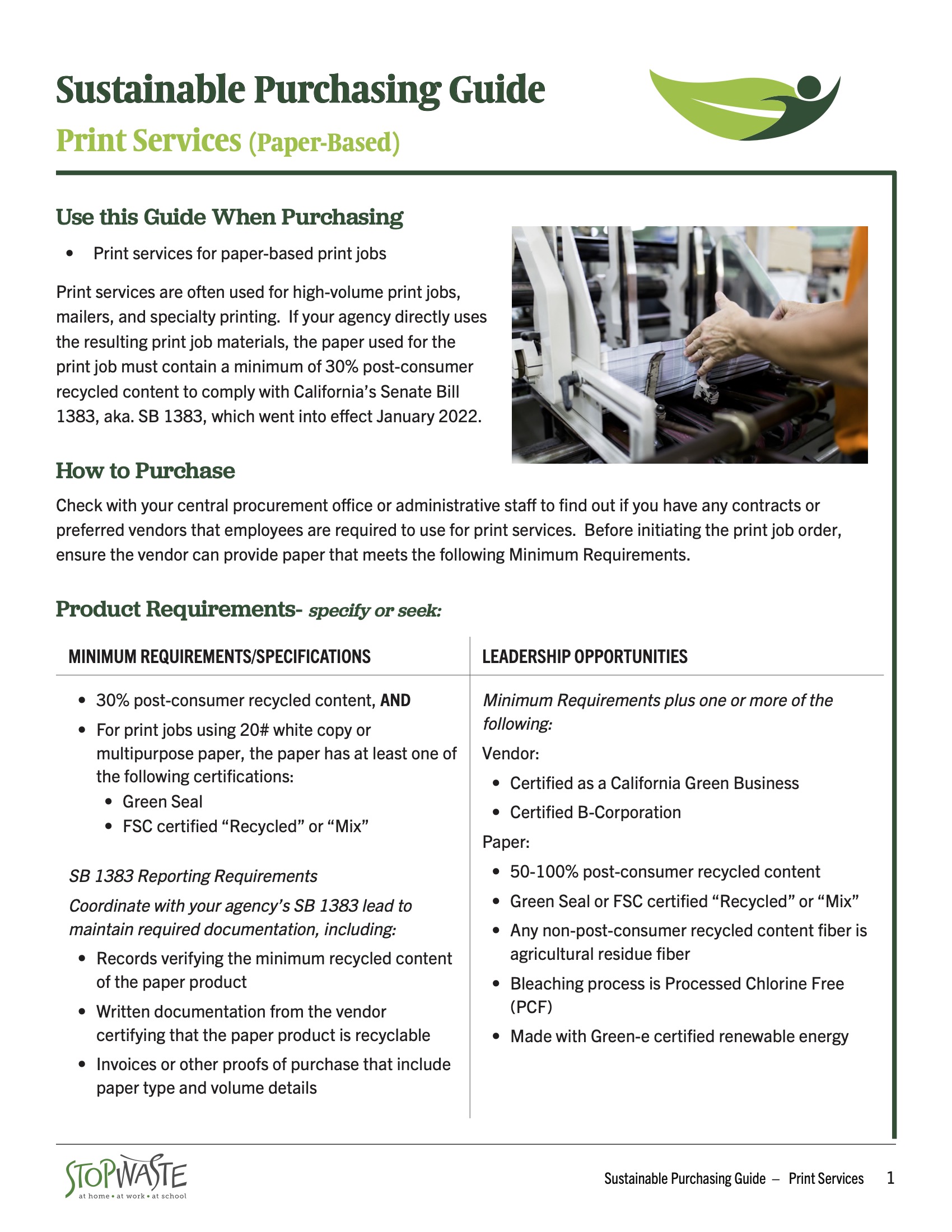 Print services are often used for high-volume print jobs, mailers, and specialty printing. If your agency directly uses the resulting print job materials, the paper used for the print job must contain a minimum of 30% post-consumer recycled content to comply with California’s Senate Bill 1383, aka. SB 1383, which went into effect January 2022.