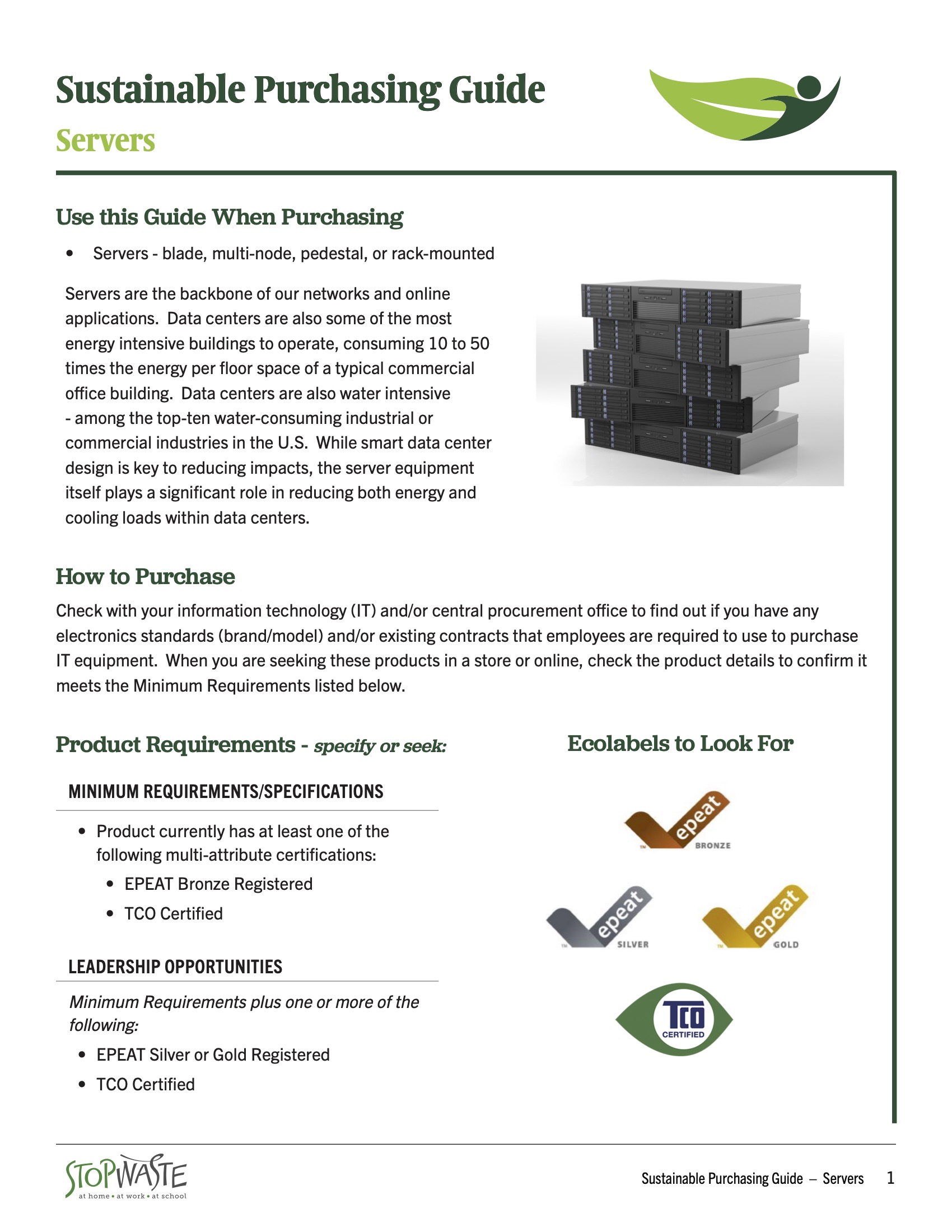 Servers are the backbone of our networks and online applications. Data centers are also some of the most energy intensive buildings to operate, consuming 10 to 50 times the energy per floor space of a typical commercial office building. Data centers are also water intensive - among the top-ten water-consuming industrial or commercial industries in the U.S. While smart data center design is key to reducing impacts, the server equipment itself plays a significant role in reducing both energy and cooling loads within data centers.