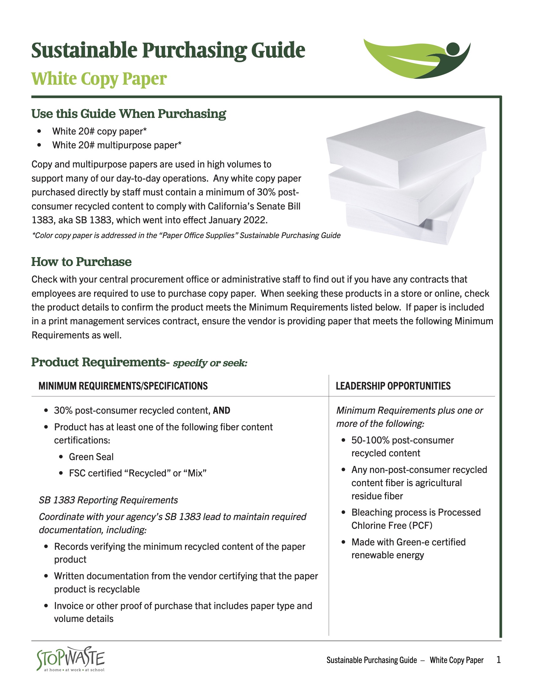 Copy and multipurpose papers are used in high volumes to support many of our day-to-day operations. Any white copy paper purchased directly by staff must contain a minimum of 30% post- consumer recycled content to comply with California’s Senate Bill 1383, aka SB 1383, which went into effect January 2022.