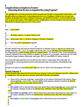 California State law, SB 1383, aims to keep food and other compostable materials ("organics") out of landfills to reduce emissions that contribute to climate change. Support your efforts to educate staff and custodians about your composting and recycling program with a memo that can be emailed, distributed in hard copy, or posted in a high traffic back-of-house area. The template is easy to modify.